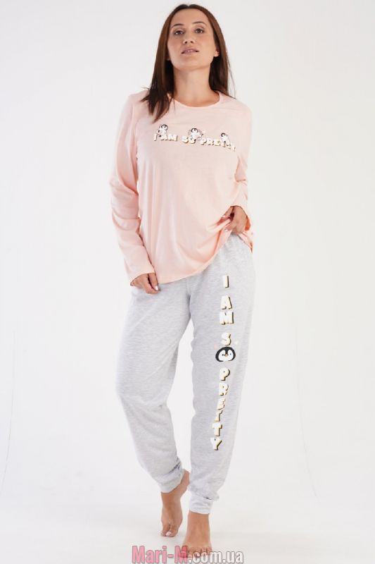 Хлопковая женская пижама 303285 Vienetta. Пижама выполнена из натурального мягкого хлопкового трикотажа. В комплект входит свободная однотонная кофта и меланжевые брюки. Кофта с длинными рукавами и круглым вырезом горловины, украшена принтом-надписью на груди. Брюки с широкой резинкой с завязками в поясе, штанины с манжетами, одна штанина с крупным принтом в виде надписи. Состав: 100% хлопок.