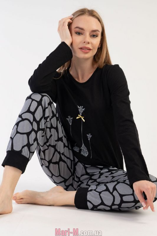Женская пижама из хлопка 303288 Vienetta. Пижама выполнена из натурального мягкого хлопкового трикотажа. В комплект входит свободная однотонная кофта и брюки с крупным анималистичным принтом. Кофта с длинными рукавами и круглым вырезом горловины, украшена принтом с изображением жирафов и миниатюрным атласным бантиком на передней полочке. Брюки с широкой резинкой с завязками в поясе, штанины с манжетами. Состав: 100% хлопок.