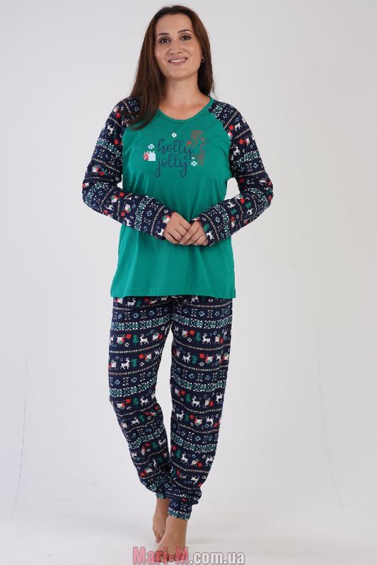Хлопковая пижама 304125 Vienetta. Пижама выполнена из натурального мягкого хлопкового трикотажа. В комплект входит свободная кофта с длинными рукавами и круглым вырезом горловины и брюки. Передняя полочка кофты и спинка выполнены из однотонного полотна, рукава-реглан – из ткани с набивным принтом в рождественском стиле. Кофта украшена принтом-надписью на груди. Брюки с широкой резинкой с завязками в поясе. Состав: 100% хлопок.