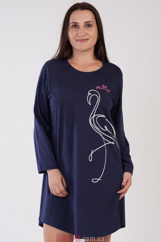 Ночная сорочка из хлопка 307007 Vienetta. Сорочка выполнена из натурального мягкого хлопкового трикотажа темно-синего цвета, украшена контрастным принтом на передней полочке. Модель свободного кроя, с длинными рукавами и неглубоким круглым вырезом горловины. Полочки снизу закруглены к бокам. Состав: 100% хлопок.