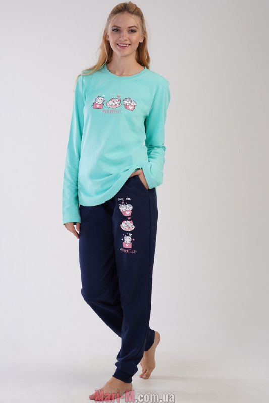 Хлопковая пижама 309001 Vienetta. Пижама выполнена из натурального мягкого хлопкового трикотажа. В комплект входит свободная кофта с длинными рукавами и круглым вырезом горловины и брюки. Кофта украшена забавным принтом с изображением котят на груди. Брюки с боковыми карманами, в поясе широкая резинка с завязками, штанины с манжетами. Состав: 100% хлопок.