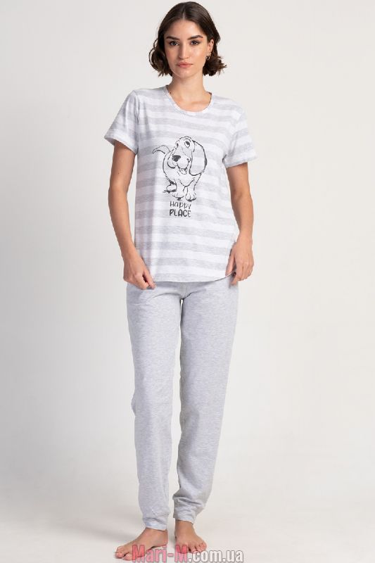 Хлопковая пижама с короткими рукавами 312033 Vienetta. Пижама выполнена из натурального мягкого хлопкового трикотажа. В комплект входит футболка в широкую горизонтальную полоску и однотонные брюки. Футболка с короткими рукавами и круглым вырезом горловины, украшена принтом с изображением песика на передней полочке. Брюки с широкой резинкой с завязками в поясе, штанины с манжетами. Состав: 100% хлопок.