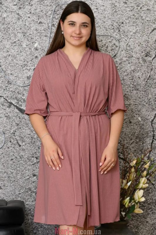 Розово-коричневый женский халат 3400-5 Bahar. Халат выполнен из приятного трикотажного полотна в рубчик. Модель средней длины, на запах под пояс, с рукавами длиной ½. Полочки отделаны широким кантом из такой же ткани, подол и низ рукавов с волнистой отделкой плоским швом. Состав: 80% полиэстер, 15% вискоза, 5% эластан.