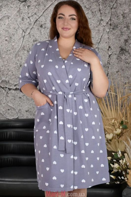 Серый хлопковый халат 3500-6 Bahar. Халат выполнен из мягкого хлопкового трикотажа серого цвета с принтом в виде сердечек. Модель средней длины, на запах под пояс, с рукавами длиной 3/4. Сбоку на уровне бедра накладной карман. На рукавах небольшие разрезы. Состав: 95% хлопок, 5% эластан.