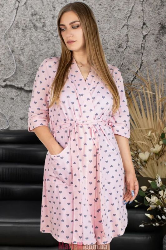 Пудровый хлопковый женский халат 3600-8 Bahar. Халат выполнен из очень мягкого и приятного хлопкового трикотажа пудрового цвета с принтом в виде сердечек. Модель на запах под пояс, с прямыми рукавами до локтя и накладным карманом на уровне бедер. Карманы, полочки и рукава по низу отделаны широким кантом. Состав: 95% хлопок, 5% эластан.