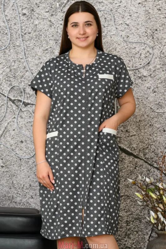 Темно-серый хлопковый женский халат на молнии 3900-2 Bahar. Халат выполнен из мягкого натурального хлопкового трикотажа темно-серого цвета с принтом в крупный горох. Модель прямого кроя, с короткими рукавами и неглубоким круглым вырезом горловины, застегивается на молнию спереди. На уровне бедер накладные карманы, на груди декоративная планка. Карманы отделаны кантом в тон принту. Состав: 100% хлопок.
