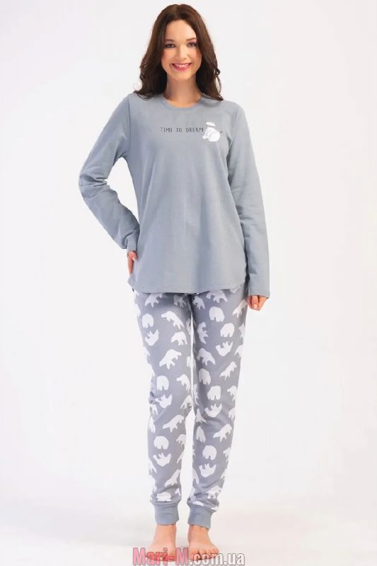 Теплая хлопковая пижама 403036 Vienetta. Комфортная пижама из мягкого теплого хлопкового трикотажа на баечке. В комплект входит однотонная свободная кофта с длинными рукавами и неглубоким круглым вырезом горловины и зауженные к низу брюки с принтом в виде белых медведей. Кофта украшена небольшим принтом с изображением медведя и надписью на груди. Брюки с широкой резинкой с завязками в поясе, штанины с манжетами. Состав: 100% хлопок.