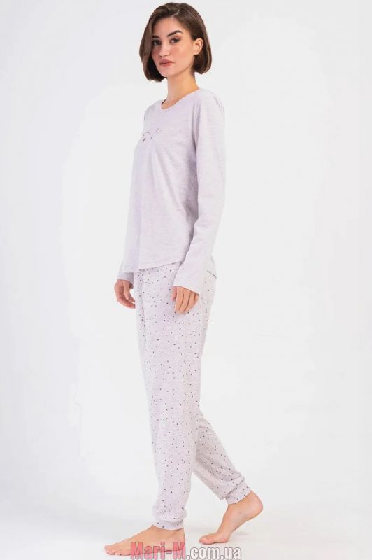 Женская пижама 403224 Vienetta. Пижама выполнена из мягкого и приятного трикотажа. В комплект входит однотонная кофта и брюки с мелким принтом. Кофта с длинными рукавами и неглубоким круглым вырезом горловины, украшена небольшим принтом на груди. Брюки с широкой резинкой с завязками в поясе, штанины с манжетами.