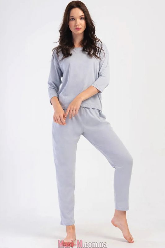 Хлопковая женская пижама 403235 Vienetta. Пижама выполнена из натурального мягкого хлопкового трикотажа. В комплект входит кофта с рукавами ¾ и зауженные к низу брюки. Кофта с круглым вырезом горловины, отделана вертикальными декоративными швами на передней полочке. Рукава со спущенной плечевой линией. Брюки с боковыми карманами и широкой комфортной резинкой в поясе. Состав: 100% хлопок.