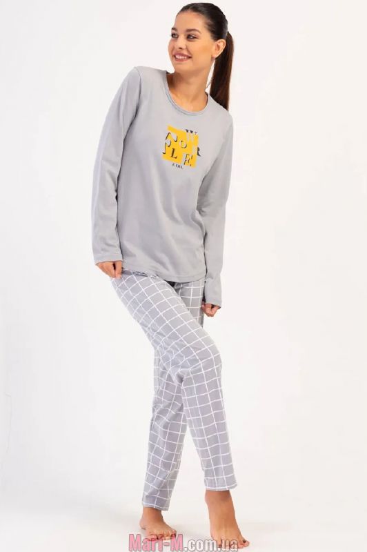 Хлопковая женская пижама 403253 Vienetta. Пижама выполнена из натурального мягкого хлопкового трикотажа. В комплект входит свободная однотонная кофта и брюки с принтом в клетку. Кофта с длинными рукавами и неглубоким круглым вырезом горловины, украшена ярким принтом на груди. Брюки с широкой резинкой с завязками в поясе. Состав: 100% хлопок.