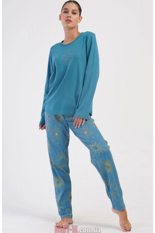 Пижама из хлопка 403367 Vienetta. Пижама выполнена из натурального мягкого хлопкового трикотажа (интерлок). В комплект входит свободная однотонная кофта и брюки с тонким принтом с изображением звезд. Кофта с длинными рукавами и неглубоким круглым вырезом горловины, украшена небольшим принтом на груди. Брюки с широкой резинкой с завязками в поясе. Состав: 100% хлопок.