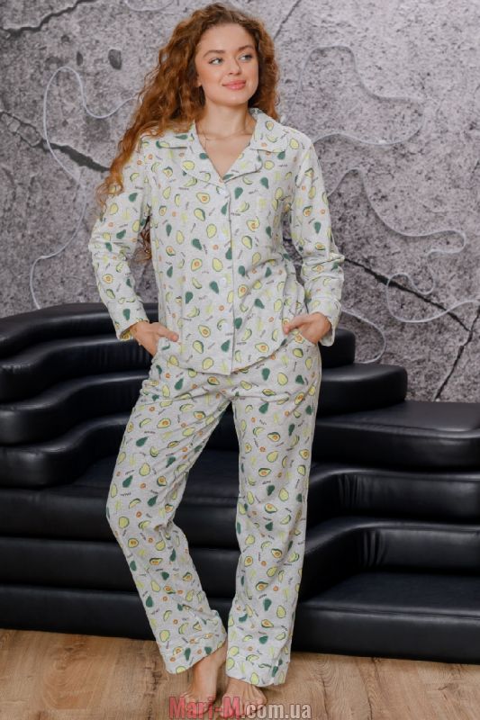 Серая хлопковая пижама с принтом 4050-5 Bahar. Пижама выполнена из хлопкового трикотажного полотна-двухнитки. В комплект входит свободная рубашка с длинными рукавами и прямые брюки на мягкой резинке в поясе. Рубашка с фигурным отложным воротником и V-образным вырезом, застегивается на пуговицы спереди, декорирована накладным карманом на груди. Брюки с удобными боковыми карманами. Состав: 100% хлопок.