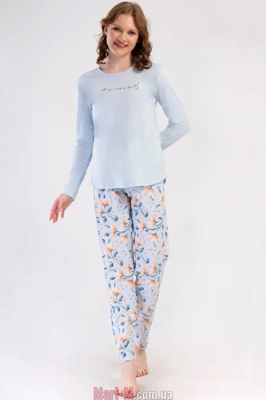 Хлопковая женская пижама 409204 Vienetta. Пижама выполнена из очень мягкого и приятного натурального хлопкового трикотажа. В комплект входит однотонная кофта с длинными рукавами и неглубоким круглым вырезом горловины и прямые брюки с нежным цветочным принтом. Кофта украшена тонким принтом-надписью на груди. Брюки с широкой резинкой с завязками в поясе. Состав: 100% хлопок.