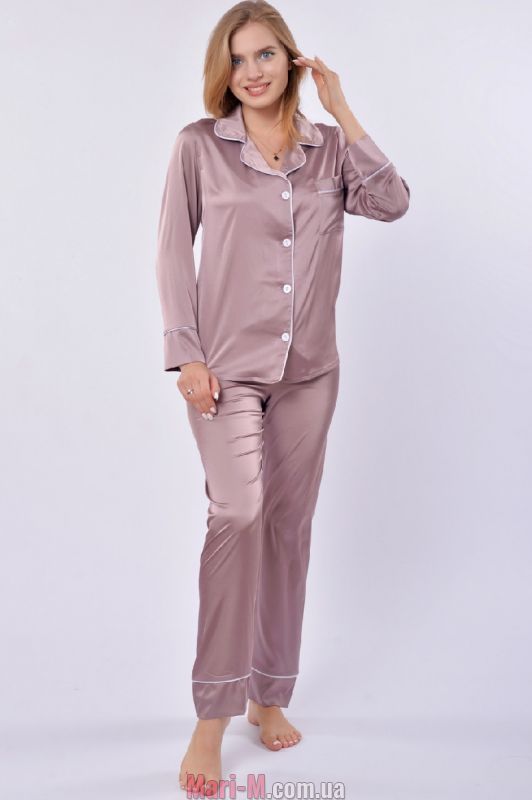 Пудровая шелковая пижама 4210-1 Bahar. Пижама выполнена из приятного шелковистого материала с атласным блеском (шелк Армани). Комплект состоит из рубашки с длинными рукавами и фигурным отложным воротником и прямых брюк на мягкой резинке в поясе. Рубашка на пуговицах, с накладным нагрудным карманом. Пижама отделана узким контрастным кантом. Состав: 95% искусственный шелк, 5% эластан.