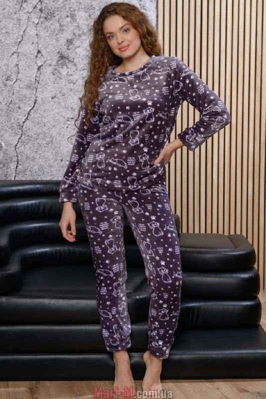 Графитовая пижама из велсофта с принтом 5010-4 Bahar. Теплая женская пижама из пушистого материала с очень мягким и густым коротким ворсом (велсофт) темно-серого цвета с принтом в виде котиков. Комплект состоит из кофты с длинными рукавами и неглубоким круглым вырезом горловины и прямых брюк на мягкой резинке в поясе. Рукава и штанины с широкими манжетами. Состав: 100% полиэстер.