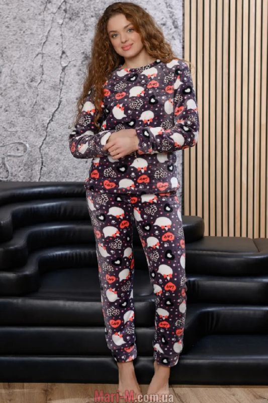 Графитовая пижама из велсофта с принтом 5010-5 Bahar. Теплая женская пижама из пушистого материала с очень мягким и густым коротким ворсом (велсофт) серого цвета с ярким оригинальным принтом с сердечками. Комплект состоит из кофты с длинными рукавами и неглубоким круглым вырезом горловины и прямых брюк на мягкой резинке в поясе. Рукава и штанины с широкими манжетами. Состав: 100% полиэстер.