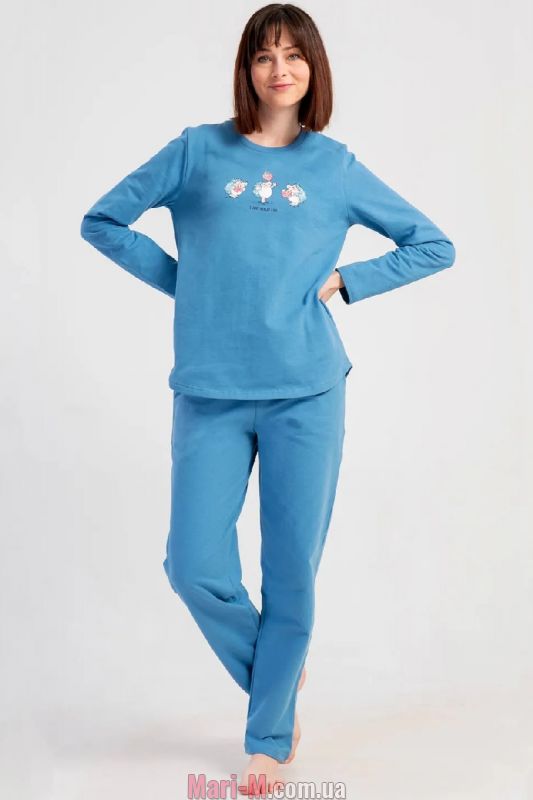 Женская пижама из хлопка 502014 Vienetta. Пижама выполнена из очень мягкого и приятного хлопкового трикотажа. В комплект входит кофта с длинными рукавами и неглубоким круглым вырезом горловины и прямые брюки с широкой мягкой резинкой со шнурком на кулиске в поясе. Кофта украшена забавным принтом с изображением ежиков на груди. Состав: 100% хлопок.