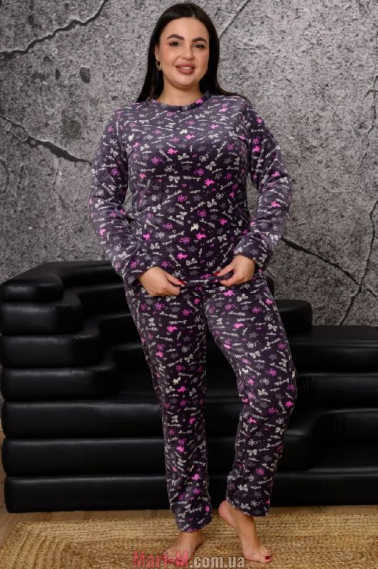 Графитовая пижама из велсофту с принтом 5020-6 Bahar. Теплая женская пижама из пушистого материала с очень мягким и густым коротким ворсом (велсофт) темно-серого цвета с милым принтом с бабочками и звездочками. Комплект состоит из кофты с длинными рукавами и неглубоким круглым вырезом горловины и прямых брюк на мягкой резинке в поясе. Рукава и штанины с широкими манжетами. Состав: 100% полиэстер.
