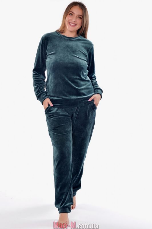 Изумрудный велюровый комплект для дома 6010-2 Bahar. Стильный домашний костюм из приятного на ощупь бархатистого материала «королевский велюр». В комплект входит джемпер с длинными рукавами и неглубоким круглым вырезом и брюки на мягкой резинке в поясе. Штанины, рукава и низ джемпера с широкими пришивными манжетами. Брюки с удобными боковыми карманами. Подходит как для сна, так и для отдыха дома. Состав: 100% полиэстер.