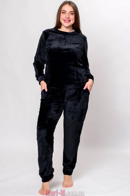 Черный велюровый комплект для дома 6010-6 Bahar. Стильный домашний костюм из приятного на ощупь бархатистого материала «королевский велюр». В комплект входит джемпер с длинными рукавами и неглубоким круглым вырезом и брюки на мягкой резинке в поясе. Штанины, рукава и низ джемпера с широкими пришивными манжетами. Брюки с удобными боковыми карманами. Подходит как для сна, так и для отдыха дома. Состав: 100% полиэстер.