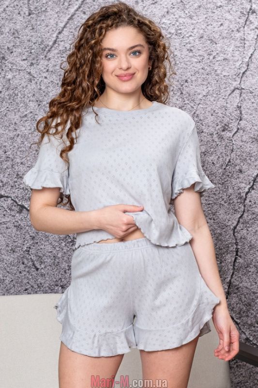 Серая хлопковая пижама с оборками 9000-2 Bahar. Пижама выполнена из очень мягкого и приятного хлопкового трикотажа (рибана) с мелким графичным узором. В комплект входит укороченная футболка и шорты на мягкой резинке в поясе. Футболка с короткими рукавами и неглубоким круглым вырезом горловины. Рукава и шорты украшены оборками по низу. Шорты с вырезами по бокам. Изделия с плоскошовной волнистой отделкой края. Состав: 95% хлопок, 5% эластан.