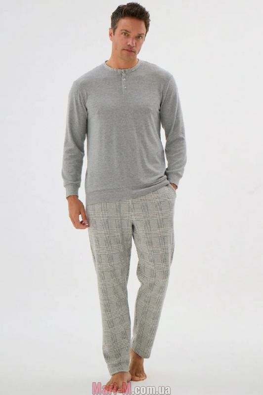Мужская пижама с вискозой 9618 Sevim. Пижама выполнена из теплого трикотажного полотна с высоким содержанием вискозы. В комплект входит однотонный меланжевый джемпер и прямые брюки в клетку. Джемпер с пришивным поясом по низу, длинные рукава с манжетами, неглубокий круглый вырез горловины отделан принтованным кантом в тон брюкам и дополнен планкой на пуговицах. Брюки с боковыми карманами и мягкой резинкой в поясе. Состав: 49% полиэстер, 47% вискоза, 4% эластан.