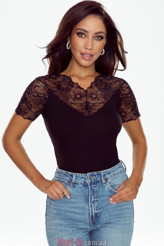 Блузка из вискозы и кружева Firella Eldar. Элегантная блузка выполнена из мягкого вискозного трикотажа и нежного цветочного кружева с фигурным краем. Модель с короткими кружевными рукавами и неглубокими V-образными вырезами спереди и на спинке. Состав: 75% вискоза, 20% полиамид, 5% эластан.
