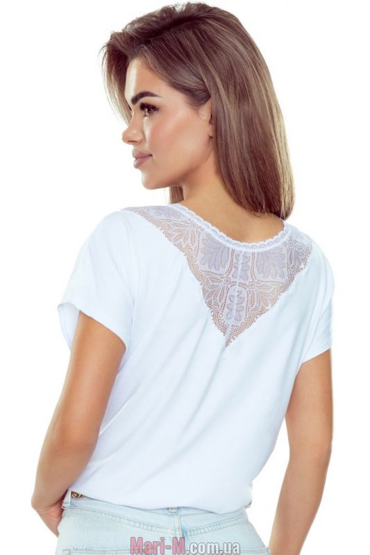 Блузка из вискозы с кружевной вставкой Miriam Eldar. Свободная блузка с короткими цельнокроеным рукавами выполнен из мягкого вискозного трикотажа и украшена вставкой из тонкого ажурного кружева на вырезе. Вырез горловины отделан кружевной тесьмой. Особенность модели состоит в том, что ее можно носить двумя способами – кружевной вставкой спереди или на спинке. Состав: 85% вискоза, 10% полиамид, 5% эластан.