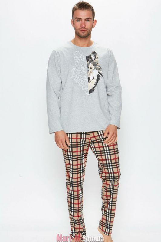 Мужская пижама из хлопка 41/5-26P/04A736 Fabio. Пижама выполнена из мягкого натурального хлопкового полотна. В комплект входит джемпер светло-серого цвета и брюки в клетчатый принт. Джемпер с длинным прямыми рукавами и неглубоким круглым вырезом горловины, на груди украшен стильным принтом с изображением волка. Брюки на мягкой резинке в поясе. Состав: 100% хлопок.