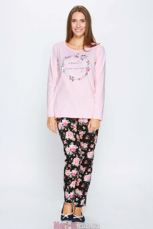 Хлопковая женская пижама 66/5-25L/144 A728 Fabio. Стильная теплая пижама, состоящая из футболки с длинными рукавами и брюк на мягкой резинке, зауженных к низу. Однотонная футболка - с полукруглым вырезом. На передней детали - принт с надписью. Брюки из материала с набивным цветочным принтом гармонично дополняют футболку. Выполнена из мягкого и приятного к телу натурального материала. Состав: 100% хлопок.
