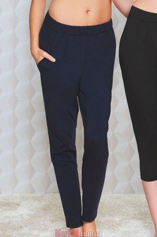 Темно-синие домашние брюки 51/9-F/66 Fabio. Удобные домашние брюки из легкого и шелковистого трикотажного материала. Модель на широкой резинке в поясе, штанины заужены к низу, по бокам карманы. Состав: 46% хлопок, 46% модал, 8% эластан.