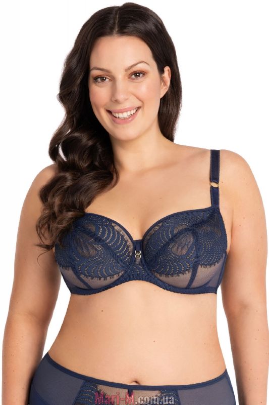 Мягкий кружевной бюстгальтер К-876 Aria Gorsenia. Изысканный бюстгальтер с мягкими чашками в насыщенном темно-синем цвете. Чашки на каркасах, сшивные, глубокие, с тройным диагональным членением, выполнены из прочной прозрачной микросетки. Чашки и мост украшены тонким ажурным кружевом с волнистым краем и ресничками. Верхняя деталь чашек отделана по краю узким эластичным кантом для лучшего прилегания. Между чашками миниатюрная золотистая подвеска в виде логотипа бренда. Спинка гладкая, из функционального сетчатого полотна. Боковые детали укреплены вертикальными косточками. Бретели не отстегиваются, регулируются по длине, их ширина зависит от размера. На спине застежка на 2/3 крючка в зависимости от размера. Бюстгальтер хорошо поддерживает и стабилизирует грудь больших и средних размеров, придает ей красивую округлую форму. За счет высокой перемычки и широко расставленных бретелей модель собирает грудь к центру, создавая эффект приподнятости. Состав: 90% полиамид, 7% эластан, 3% полиэстер.