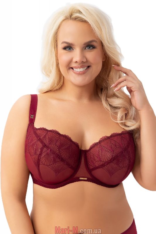 Мягкий бюстгальтер с вышивкой К-942 Mira Gorsenia. Роскошный женственный бюстгальтер с мягкими чашками в глубоком бордовом цвете, украшенный тонкой вышивкой с легким мерцающим блеском. Чашки на каркасах, сшивные, глубокие, с тройным диагональным членением, выполнены из вышитого кружева на подкладке из прочной неэластичной микросетки. По верхнему краю изнутри подшита тонкая резиночка для лучшего прилегания. Пояс гладкий, из устойчивой к растяжению лайкры. Боковые детали укреплены вертикальными косточками. Бретели не отстегиваются, регулируются по длине, их ширина зависит от размера. В основании бретелей декор в виде соединенных золотистых колечек. На спине застежка на 2/3 крючка в зависимости от размера. Бюстгальтер хорошо поддерживает грудь больших и средних размеров, придает ей красивую округлую форму. Состав: 90% полиамид, 7% эластан, 3% полиэстер.