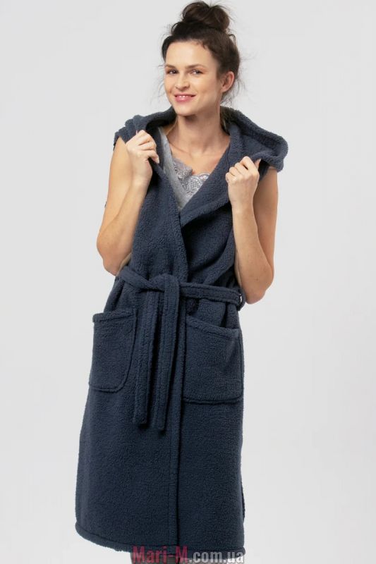 Темно-синий удлиненный теплый жилет с капюшоном LHW 151 B24 GR Key. Жилет из очень мягкого и приятного на ощупь пушистого материала, имитирующего овчину. Модель длиной до середины голени, с капюшоном и накладными карманами на уровне бедер, завязывается на запах под пояс. По бокам разрезы. Состав: 100% полиэстер.