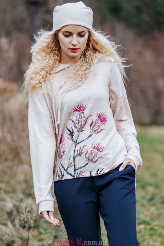 Домашний костюм LHS 508 B19 Key. Стильный домашний костюм от польского бренда Key. Костюм выполнен из высококачественной и мягкой вискозы, состоит из кофты бежевого цвета и брюк темно-синего цвета. Кофта свободного силуэта, с капюшоном на завязках, длинными рукавами с широкими манжетами и спущенной линией плеча, удлиненной спинкой и боковыми разрезами. Брюки свободные, с мягкой резинкой в поясе, внизу на манжетах, по бокам удобные карманы. Спереди кофта украшена авторским принтом цветущей веточки чертополоха. Состав: верх - 68% полиэстер, 28% вискоза, 4% эластан; низ - 65% полиэстер, 30% вискоза, 5% эластан (french terry). Шапочка в комплект не входит.