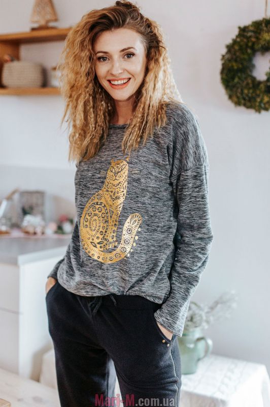 Флисовый домашний комплект/пижама LHS 742 B19 Key. Стильный домашний костюм выполнен из высококачественного мягкого флиса, состоит из кофты серого цвета и брюк черного цвета. Кофта свободного силуэта, с длинными рукавами со спущенной линией плеча, круглым вырезом горловины, внизу регулируется по ширине черным шнурком. Брюки свободные прямые, с мягкой резинкой в поясе и удобными боковыми карманами. Спереди кофта украшена эффектным принтом кота золотого цвета. Комплект подходит как для сна, так и для отдыха дома. Состав: 100% полиэстер (микрофлис).