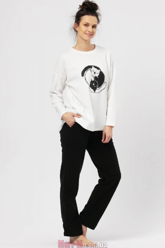 Женская пижама из микрофлиса LHS 922 B24 Key. Пижама выполнена из очень теплого и мягкого микрофлиса. Комплект состоит из свободной белой кофты и черных штанов. Кофта с круглым вырезом горловины украшена принтом с изображением спящих котов на груди. Длинные рукава со спущенной плечевой линией, спинка удлиненная. Штаны прямого кроя, с мягкой резинкой в поясе и боковыми карманами. Состав: 100% полиэстер (микрофлис).