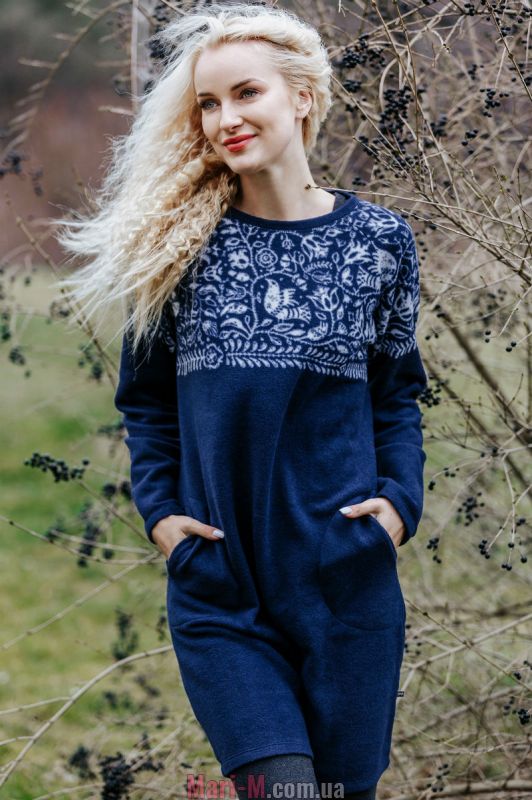 Домашнее платье/ночная сорочка из флиса LHD 082 B19 Key. Стильное домашнее платье/ночная сорочка выполнено из высококачественного мягкого флиса темно-синего цвета. Модель свободного кроя, с длинными рукавами и круглым вырезом. Длина платья выше колен, по бокам удобные карманы, верхняя часть украшена эффектным белым принтом в этническом стиле. Подходит как для сна, так и для отдыха дома. Состав: 100% полиэстер (микрофлис).