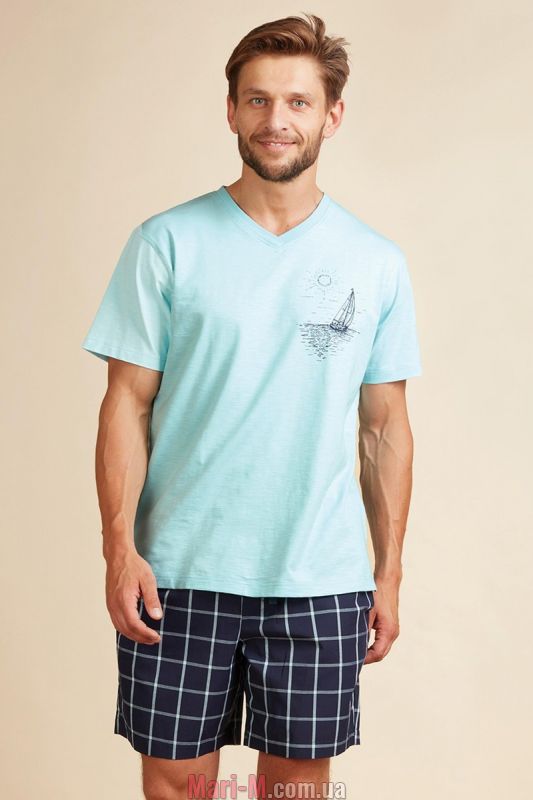Комфортный мужской комплект МNS 218 A22 Key из трикотажного хлопка. Футболка с короткими рукавами с рисунком парусника и V-образным вырезом. Свободные шорты с резинкой на талии и карманами.