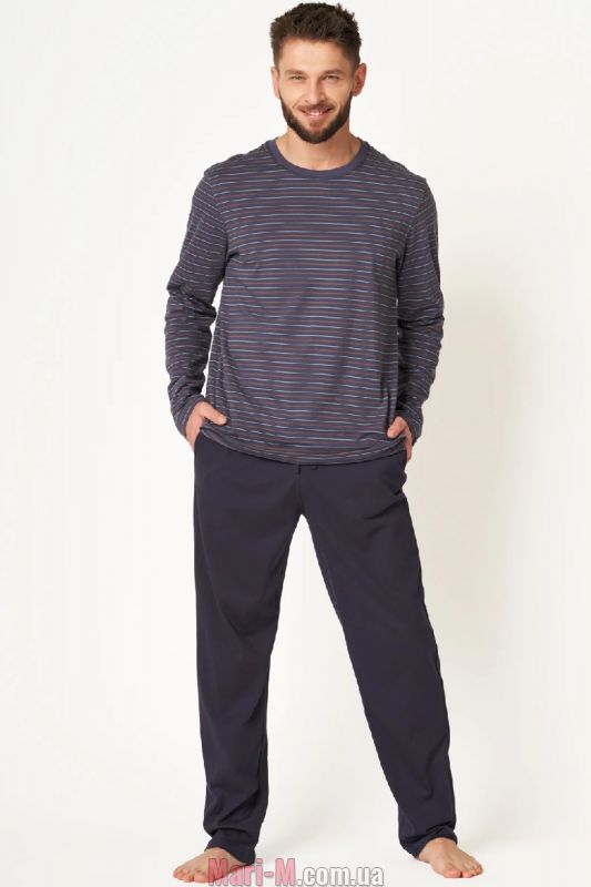Мужская пижама из хлопка MNS 304 B24 Key. Комфортная мужская пижама из высококачественного мягкого хлопкового трикотажа. В комплект входит кофта с длинным рукавом в тонкую полоску и слегка зауженные книзу однотонные брюки. Кофта с неглубоким круглым вырезом горловины, отделанным кантом в тон. Брюки с удобными боковыми карманами, в поясе мягкая резинка и шнурок на кулиске. Состав: 100% хлопок.