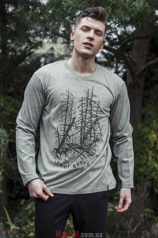 Хлопковая мужская пижама MNS 400 B8 Key. Пижама выполнена из высококачественного натурального хлопка, состоит из реглана серого цвета и свободных прямых брюк черного цвета. Реглан свободного кроя, с длинными рукавами и округлым вырезом горла, с небольшими разрезами по бокам. Штаны на мягкой резинке в поясе, регулируются с помощью шнурка, с удобными боковыми карманами. В качестве декора - по центру оригинальный принт. Состав: 100% хлопок.
