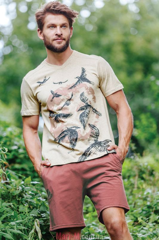 Мужская пижама из хлопка MNS 417 A20 Key. Стильная мужская пижама выполнена из качественного и мягкого хлопкового трикотажа. Комплект состоит из бежевой футболки с короткими рукавами и коричневых шорт на мягкой резинке в поясе. Футболка свободного кроя, с неглубоким V-образным вырезом горловины, передняя полочка украшена оригинальным принтом в виде летящих птиц. Шорты с удобными боковыми карманами, регулируются по ширине шнурком в поясе. Состав: 100% хлопок.