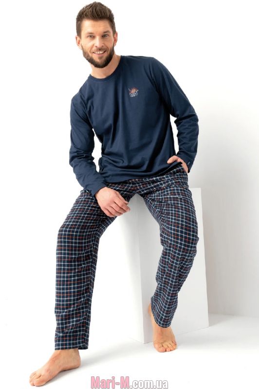 Хлопковая мужская пижама МNS 481 Key. Удобная мужская пижама состоит из однотонной трикотажной кофты темно-синего цвета и свободных фланелевых брюк в оранжево-белый клетчатый принт. Кофта с неглубоким круглым вырезом горловины, украшена небольшим принтом со стилизованным изображением лодки на груди. Брюки с удобными боковыми карманами, в поясе мягкая резинка. Состав: 100% хлопок.