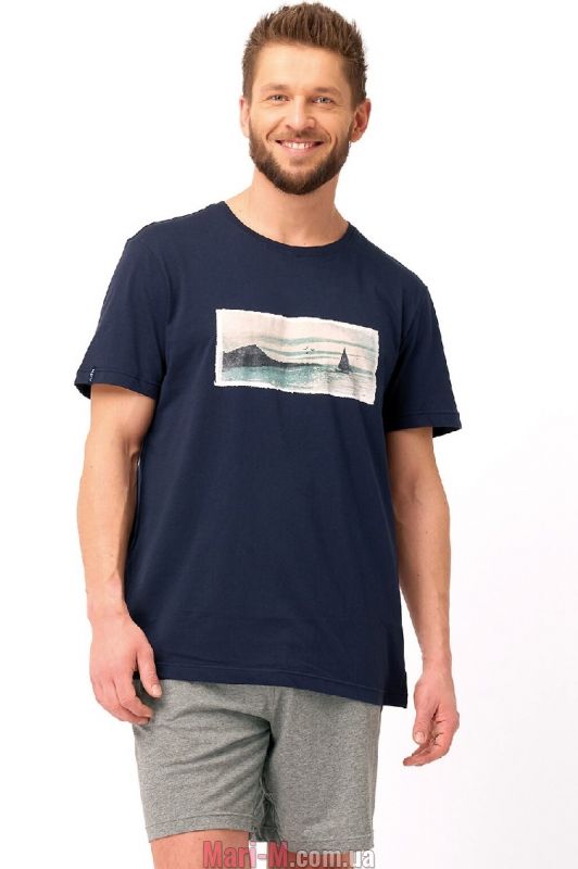 Мужская пижама из хлопка МNS 606 A25 Key. Пижама выполнена из высококачественного натурального хлопка. В комплект входит темно-синяя футболка с короткими рукавами и серые меланжевые шорты. Футболка с неглубоким круглым вырезом горловины, декорирована принтом с изображением пейзажа на груди. Свободные прямые шорты с удобными боковыми карманами и мягкой резинкой в поясе. Состав: 100% хлопок.
