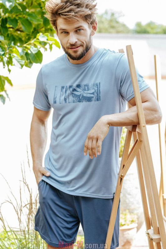 Хлопковая мужская пижама MNS 708 A20 Key. Стильная мужская пижама из качественного и мягкого хлопкового трикотажа, состоит из футболки голубого цвета и темно-синих шорт. Футболка свободного кроя, с короткими рукавами, круглым вырезом горловины, на груди по центру украшена принтом в виде стрекозы. Шорты прямые с мягкой резинкой в поясе и удобными боковыми карманами, регулируются по ширине шнурком. Состав: 95% хлопок, 5% эластан.