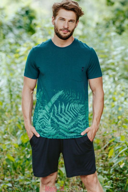 Мужская пижама из бамбука MNS 826 A20 Key. Стильная мужская пижама из нежного и легкого бамбукового трикотажа, состоит из футболки насыщенного бирюзового цвета и однотонных шорт. Футболка свободного кроя, с короткими рукавами, круглым вырезом горловины и небольшим нагрудным карманом, внизу украшена принтом в виде зеленых листьев папоротника. Шорты прямые с мягкой резинкой в поясе и удобными боковыми карманами, регулируются по ширине шнурком. Состав: 95% бамбук, 5% эластан.