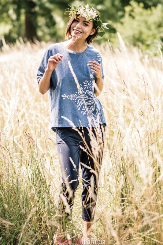 Пижама/комплект для дома из хлопка LHS 745 А19 Key. Стильный женский комплект из качественного и натурального хлопка, состоит из свободной футболки синего меланжевого цвета и однотонных капри черного цвета. Футболка с короткими рукавами, округлым вырезом горловины, капри с мягкой резинкой в поясе на завязке, по бокам карманы. В качестве декора – белый принт в фольклорном стиле, вдохновленный вышивками из Куявии, на футболке и штанине капри. Состав: 95% хлопок, 5% эластан.
