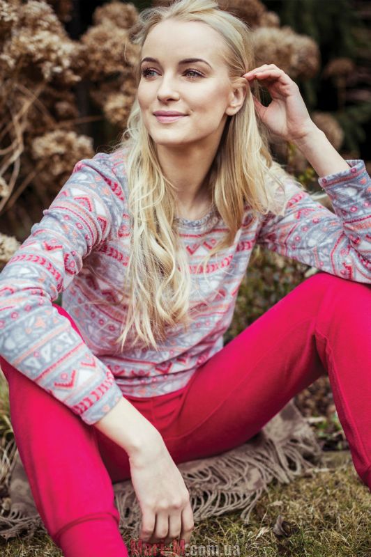 Флисовая женская пижама/домашний костюм LHS 764 B8 Key. Комплект выполнен из высококачественного, мягкого и теплого флиса, состоит из свободной кофты и зауженных брюк. Кофта серо-красного цвета в оригинальный принт-орнамент с длинными рукавами и округлым вырезом горловины, удлиненная спинка, по бокам небольшие разрезы. Штаны красного цвета на широком поясе-резинке и с широкими манжетами внизу. Состав: 100% полиэстер (флис).