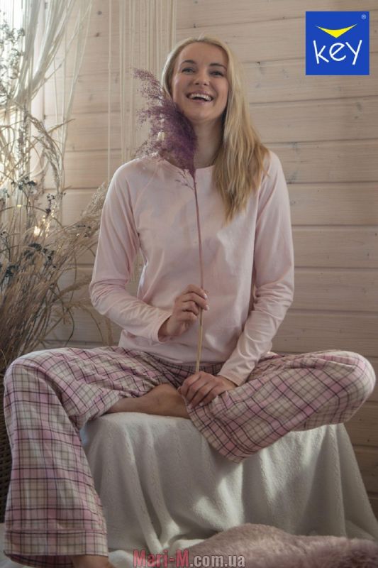 Хлопковая пижама LNS 042 B21 Key. Удобная женская пижама. В комплект входит однотонная футболка с длинными рукавами-реглан, выполненная из мягкого трикотажного полотна с высоким содержанием хлопка и свободные фланелевые брюки в клетку с мягкой резинкой в поясе. Состав: футболка - 60% хлопок, 40% полиэстер, брюки - 100% хлопок.