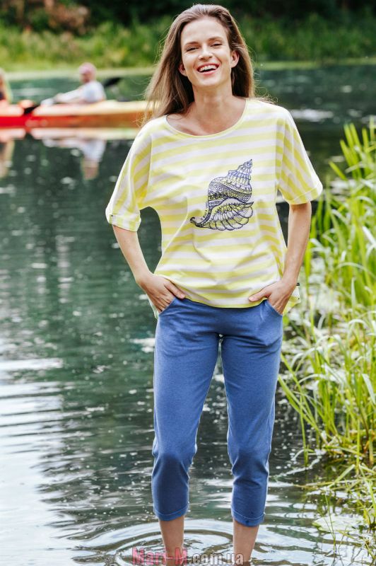 Хлопковая пижама LNS 232 A20 Key. Стильная женская пижама из качественного и мягкого хлопкового трикотажа. Комплект состоит из свободной футболки в бело-желтую полоску и однотонных укороченных брюк-капри синего цвета. Футболка с удлиненной спинкой, короткими рукавами, круглым вырезом горловины, на груди по центру украшена принтом в виде ракушки. Капри прямые, с широким комфортным поясом, внизу на закатных манжетах, по бокам удобные карманы. Состав: 95% хлопок, 5% эластан.